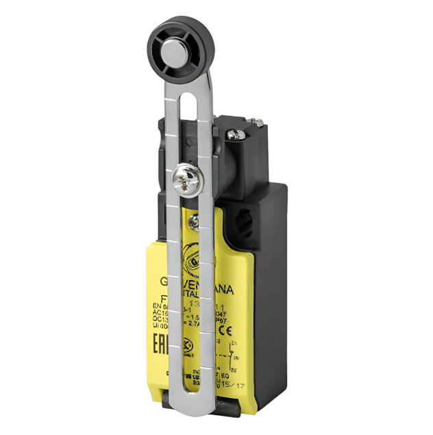 * Atuador: Alavanca curta regulável com roldana de 18 mm de diâmetro em poliamida (PA), permitindo ajuste conforme a necessidade da aplicação.