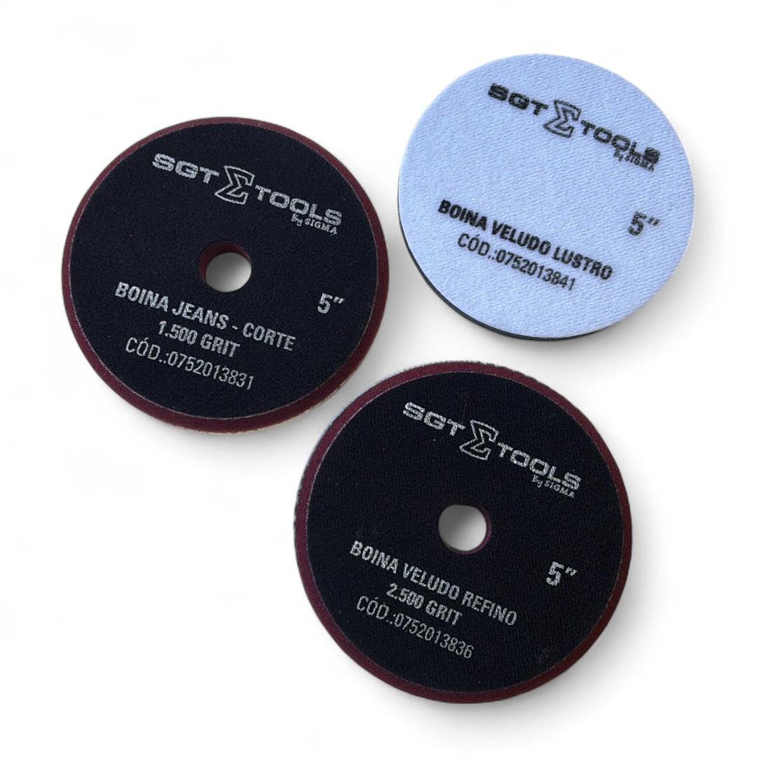 O kit combina a agressividade da boina jeans para a fase de corte pesado, removendo marcas de lixa e defeitos profundos, com a precisão das boinas de veludo exclusivas para as fases de refino e lustro.