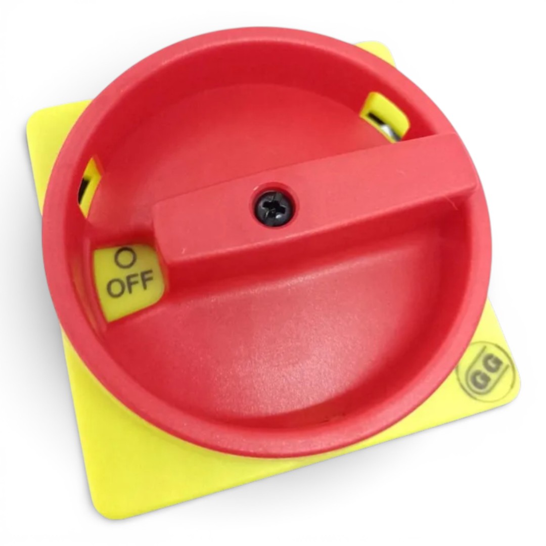 A cor vermelha vibrante sobre a moldura amarela de 67x67mm segue os padrões internacionais de sinalização de segurança, facilitando a identificação rápida em situações de manutenção ou emergência. Construída com materiais de alta durabilidade, a manopla garante resistência mecânica contra impactos e exposição em ambientes industriais, assegurando uma vida útil prolongada ao sistema de seccionamento.