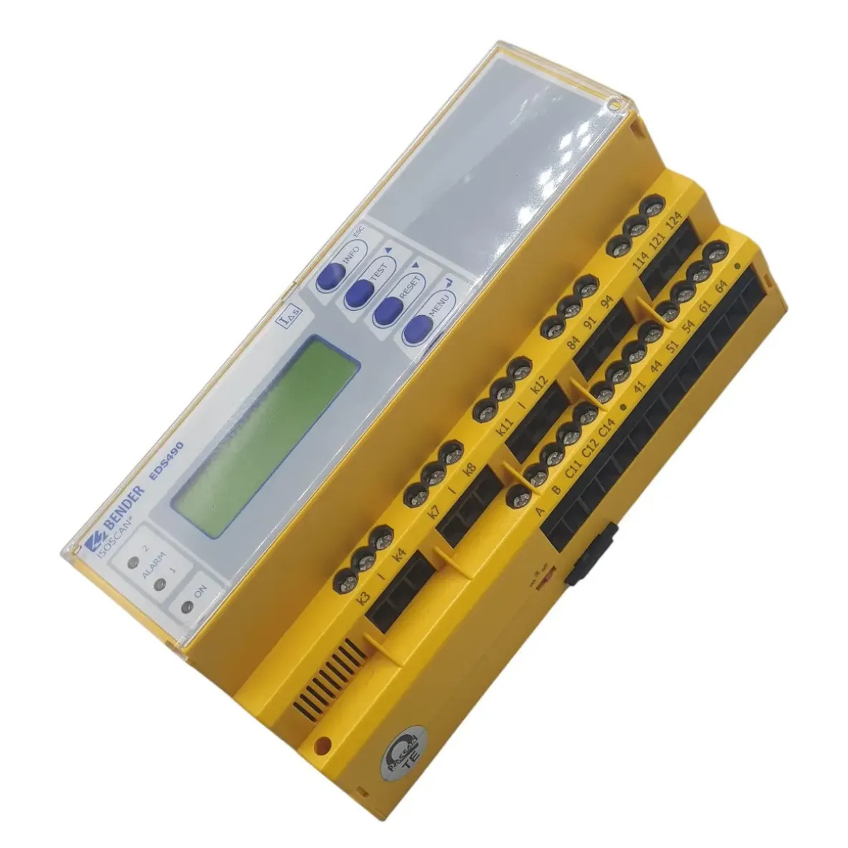 Módulo de isolamento Bender EDS490-D-2, desenvolvido para monitoramento e detecção de falhas de isolamento em sistemas elétricos.