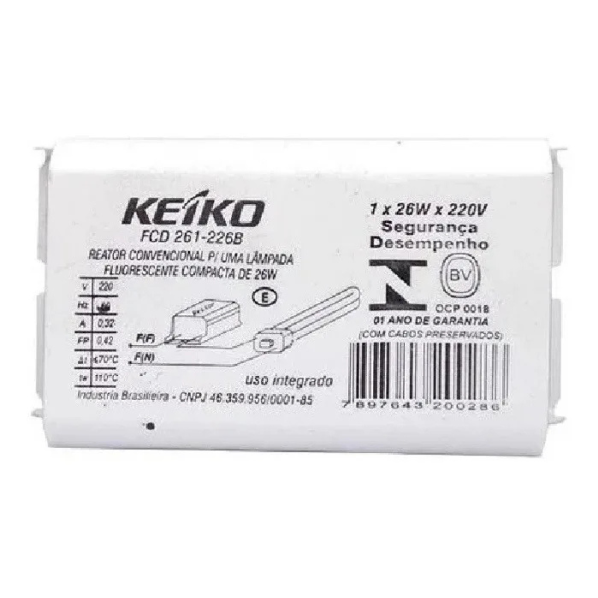 Reator convencional Keiko modelo FCD 261-226B, desenvolvido para o acionamento de lâmpadas fluorescentes compactas de 26W com base 2 pinos (2P) em redes 220V.